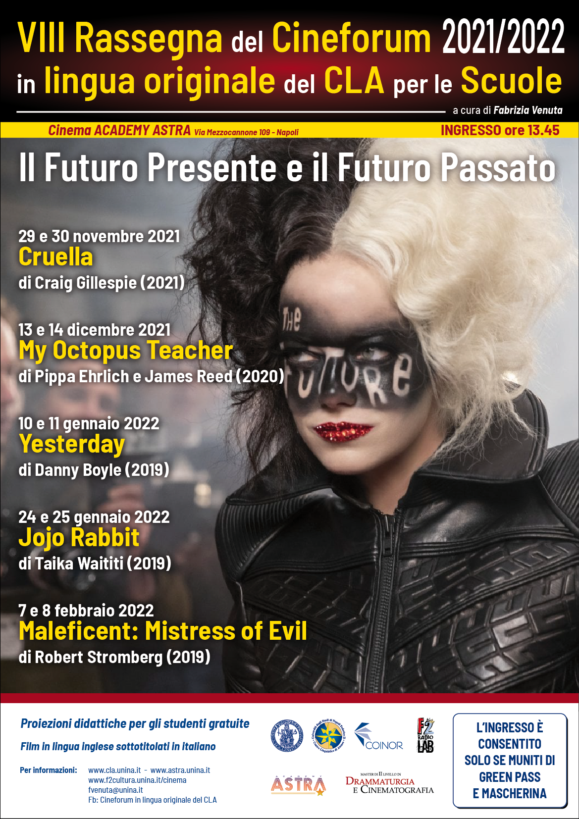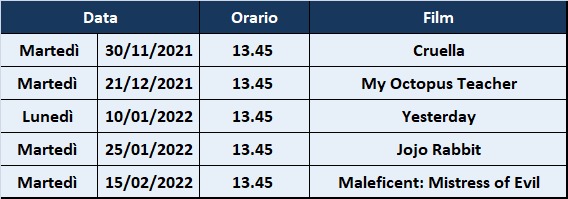 Per l’anno scolastico in corso, cui partecipano diversi alunni del nostro Istituto, la rassegna ha come tematica “Il Futuro Presente e il Futuro Passato” e prevede la proiezione dei film “Cruella”, “My octopus teacher”, “Yesterday”, “Jojo Rabbit”, “Maleficent: Mistress of Evil”.