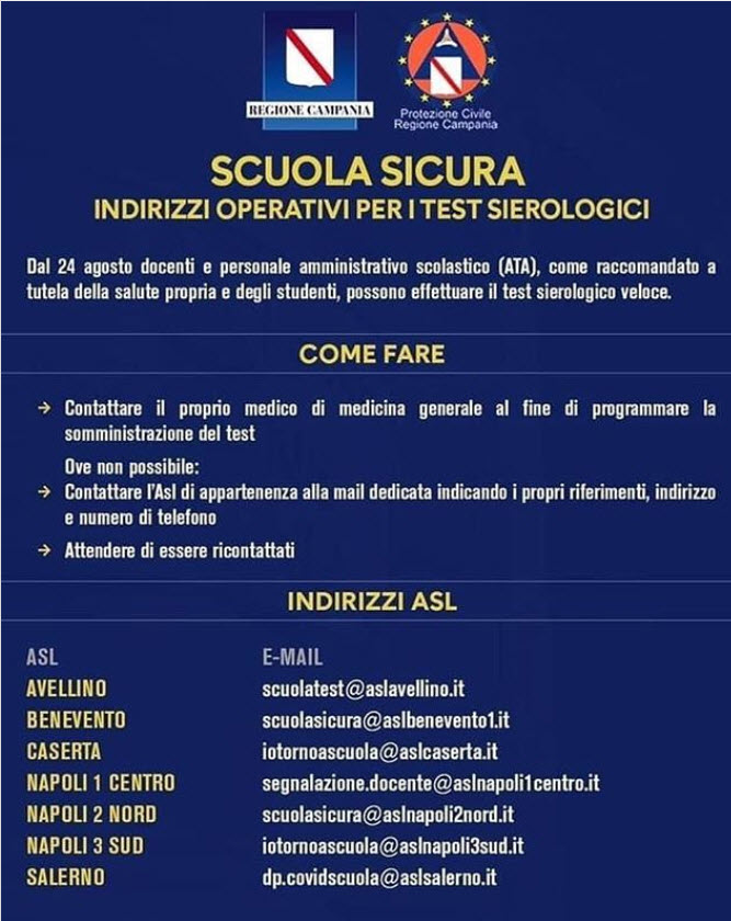 “A partire dal giorno lunedì 24 agosto il personale docente e ATA della scuola può effettuare con il proprio medico di medicina generale il test sierologico veloce.