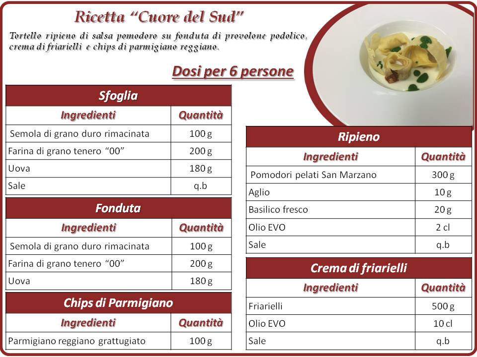"Cuore del Sud" - Tortello ripieno di salsa pomodoro su fonduta di provolone podolico, crema di friarielli e chips di parmigiano reggiano
