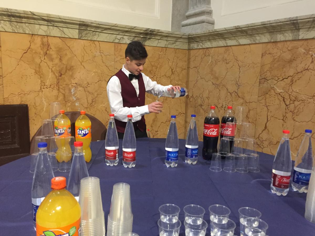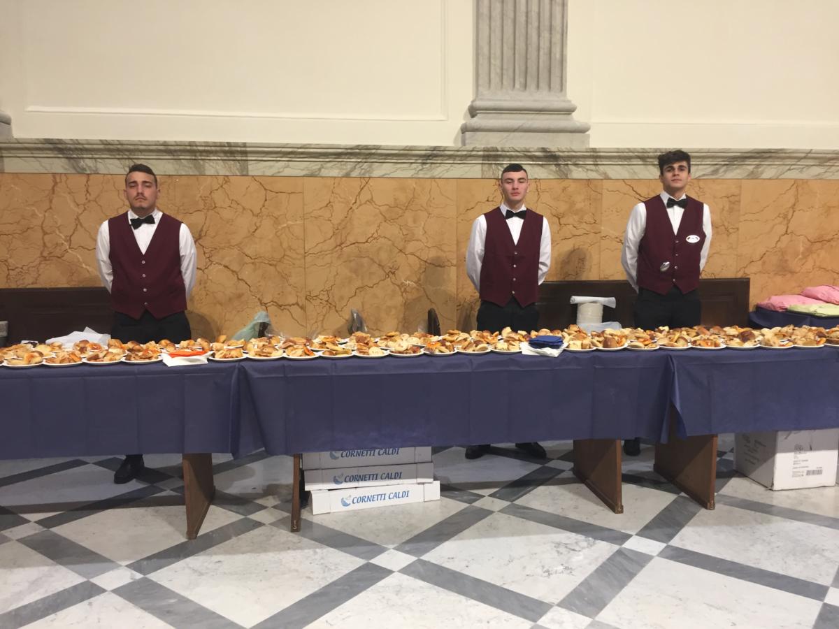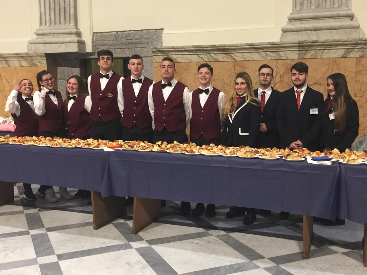 Gli alunni delle classi 4a A “Accoglienza Turistica” e 3a A “Sala e Vendita”, del Professionale Alberghiero impegnati nella gestione dell’accoglienza delle autorità e dei partecipanti e nella preparazione e gestione dei buffet di degustazione per i più bisognosi.