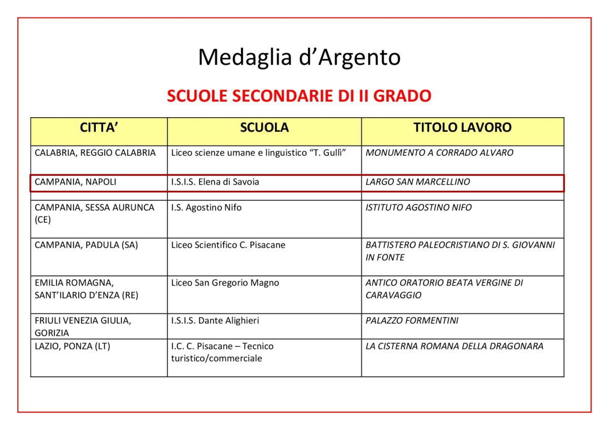 La cerimonia si è svolta il 14 novembre nel Teatrino di Corte di Palazzo Reale Napoli dove, in rappresentanza del nostro Istituto, alcune alunne della 5aA Accoglienza Turistica accompagnate dalla prof.ssa Maria Rosaria Ruggiero, hanno ritirato la Medaglia d'Argento per il lavoro sul “Largo San Marcellino” nell’ambito del progetto La scuola adotta un monumento.