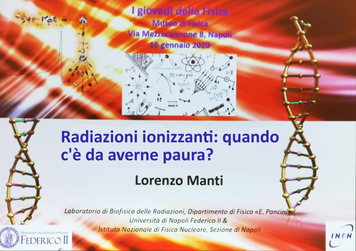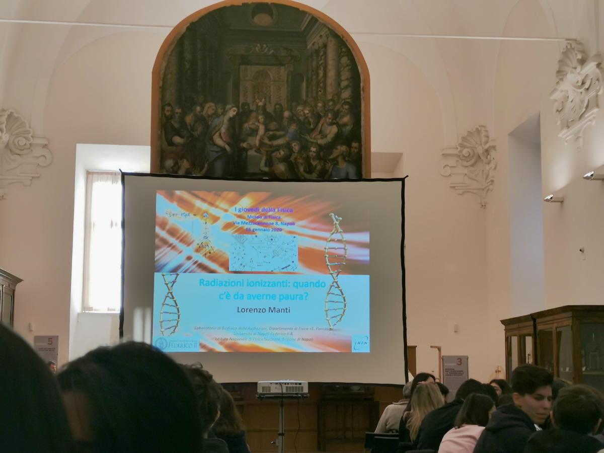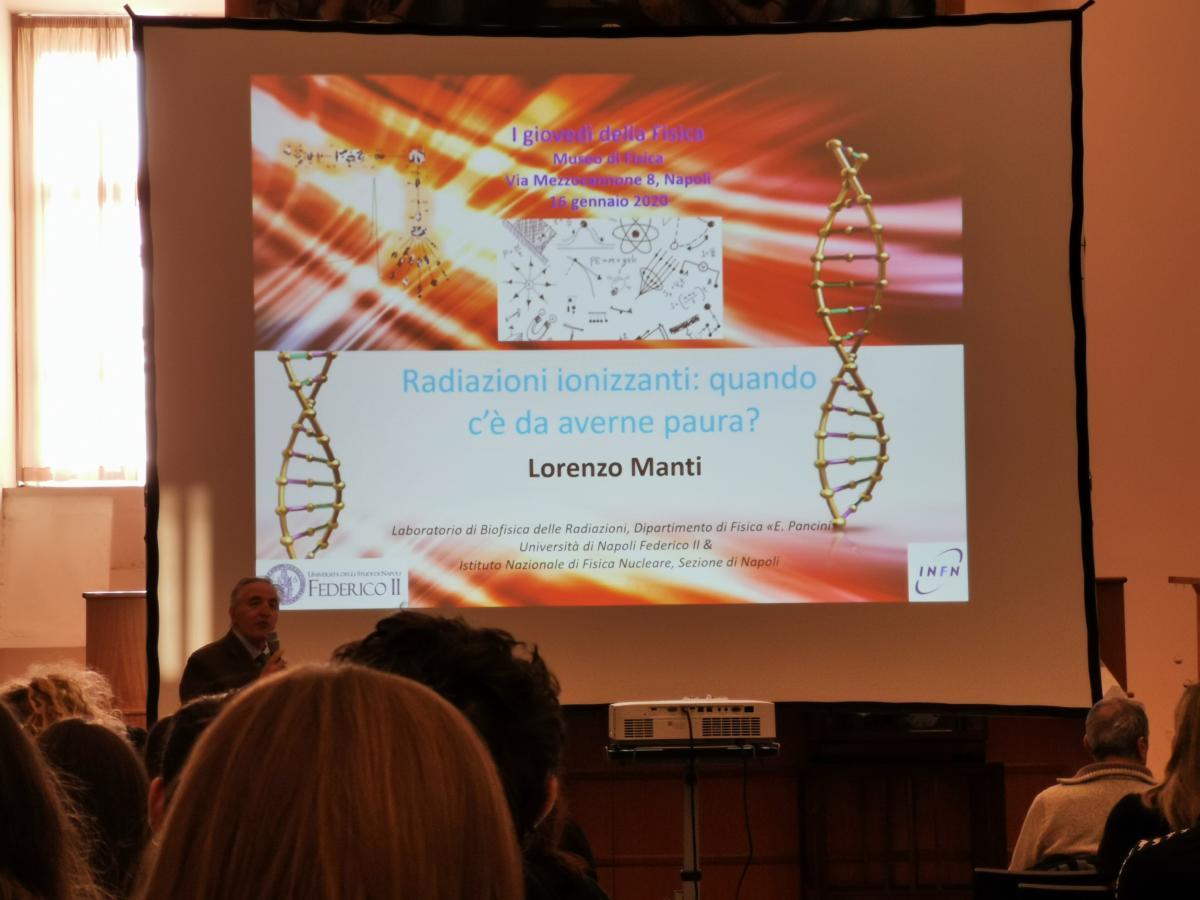 Relatore dell’incontro, organizzato dal Centro Musei in collaborazione con il Dipartimento di Fisica "E. Pancini" e con l'INFN sezione di Napoli, era il prof. Lorenzo Manti, professore di fisica applicata (a beni culturali, ambientali, biologia e medicina) presso il Dipartimento di Fisica che ha affrontato il tema delle Radiazioni Ionizzanti (IR) analizzando e presentando sia gli aspetti pericolosi per la salute umana, evidenziati ad esempio dagli studi epidemiologici sui sopravvissuti alle bombe atomiche su Hiroshima e Nagasaki, sia il loro benefico contributo dovuto agli impieghi diagnostici e terapeutici, i cui benefici sono evidenti, grazie anche all'importante ruolo che la fisica vi ha svolto.