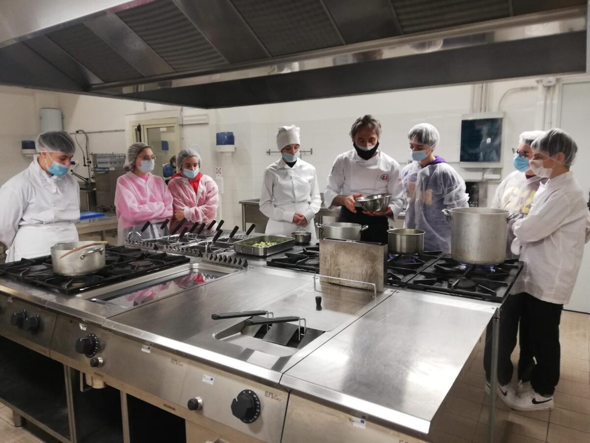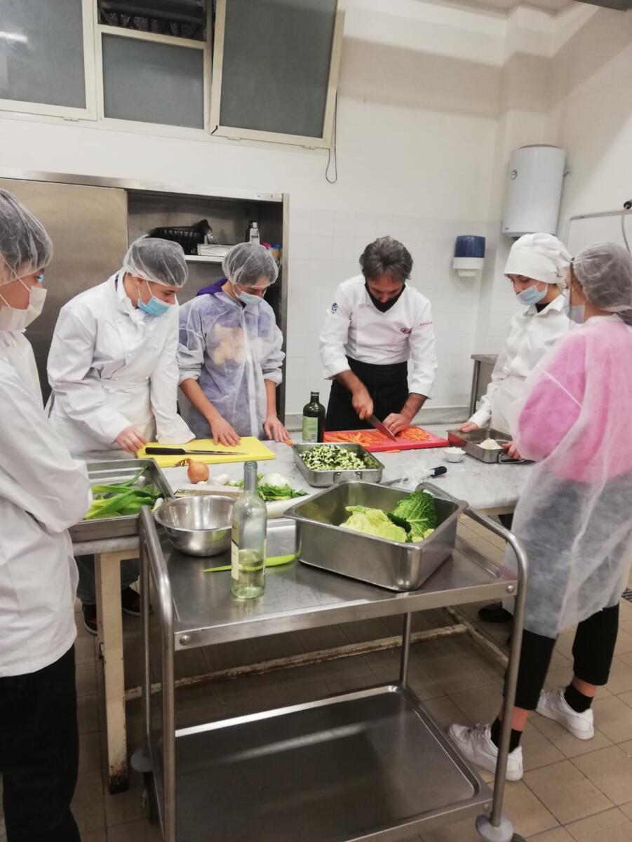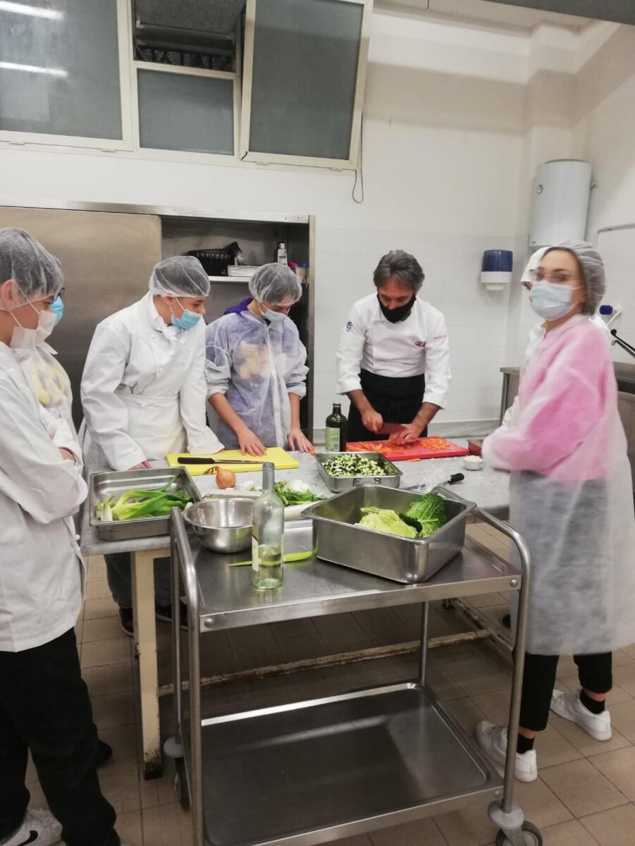 Dopo le lezioni teoriche in DAD sul taglio delle verdure, sulla brigata di cucina e sulle tecniche di mise en place, hanno potuto finalmente mettere in pratica quanto studiato e hanno preparato un Tortino di riso Carnaroli con verdure bardato con porro stufato, presentato con riduzione di balsamico e polvere di curry.