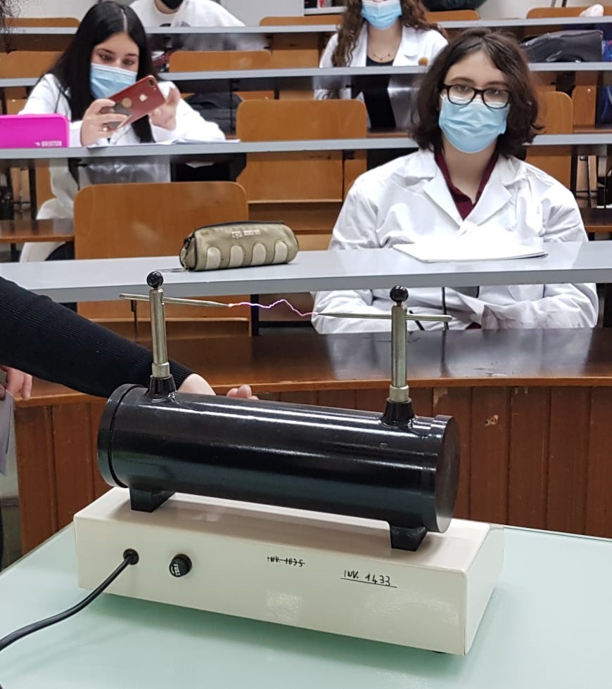 La prima parte della giornata è trascorsa nel Laboratorio di Fisica, dove hanno partecipato ad una serie di esperimenti dedicati alla termodinamica, tra cui la verifica delle leggi della dilatazione termica di solidi, liquidi e gas, con dilatometro, anello di Gravesande e termometri a diversa portata, ed all’elettrostatica con elettroscopi, gabbia di Faraday, apparato di Van der Graaf, rocchetto di Ruhmkorff, arganello elettrico e tanti altri strumenti.
